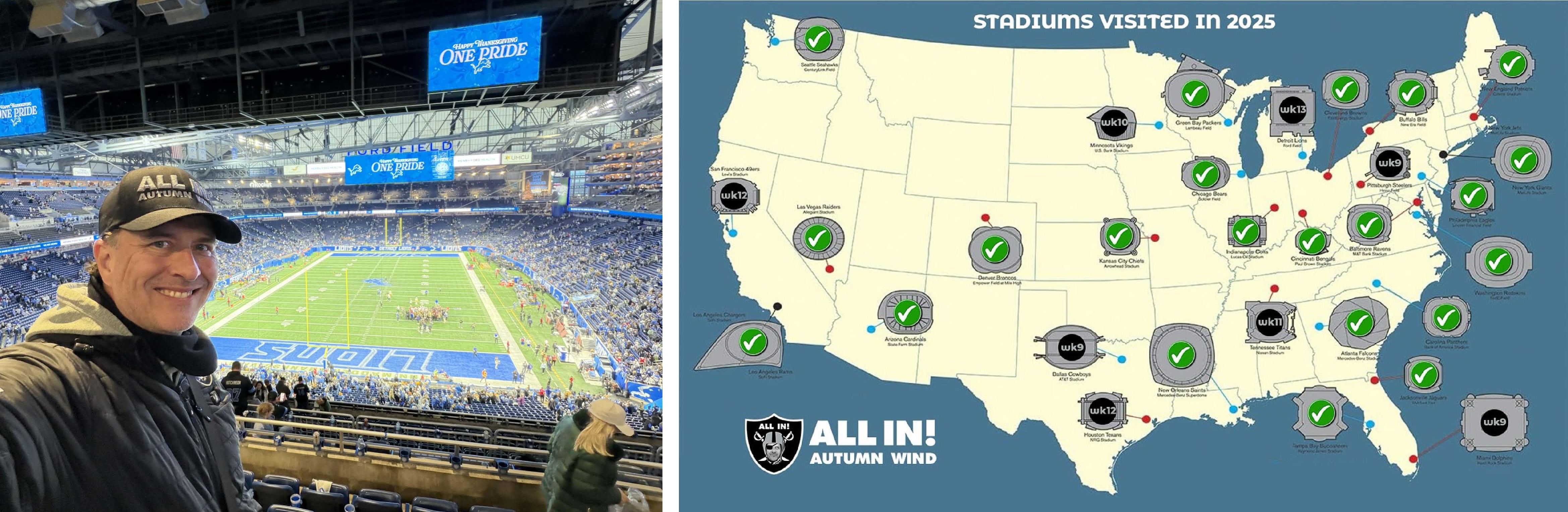 Two decades after Pete’s groundbreaking tour, fans continue to chase the records he inspired. The latest is Brian Fowler, a devoted Raiders fan who is attempting one of the most ambitious NFL journeys ever undertaken. Fowler is not just trying to break a record. He is aiming to demolish both of them at once. His goal is to attend fifty-six games during the 2025 NFL season while also completing the fastest tour of all stadiums. To accomplish this, he plans to string together triple-header weekends for 18 weeks including three Girdiron Four-Plays in weeks 13, 16 and 17.